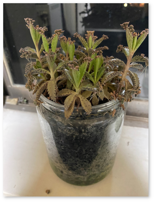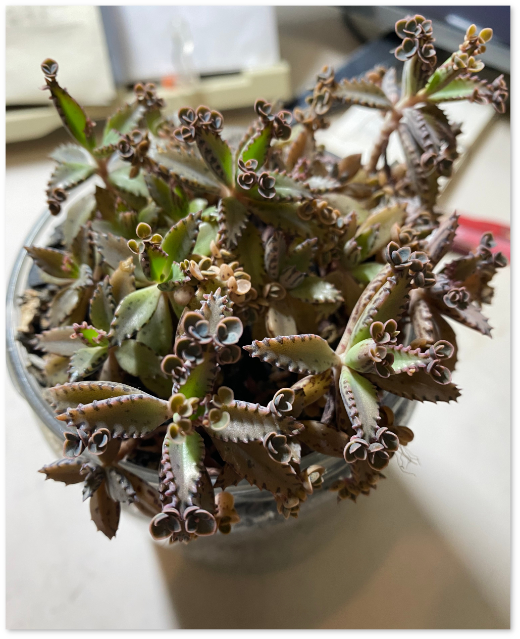 たまたまWikipediaで見たら、どうもこのこの植物は、キンチョウ Bryophyllum delagoense(錦蝶)とコダカラベンケイ(Kalanchoe daigremontiana)の交配種である「フシチョウ(不死鳥)」ということらしい。