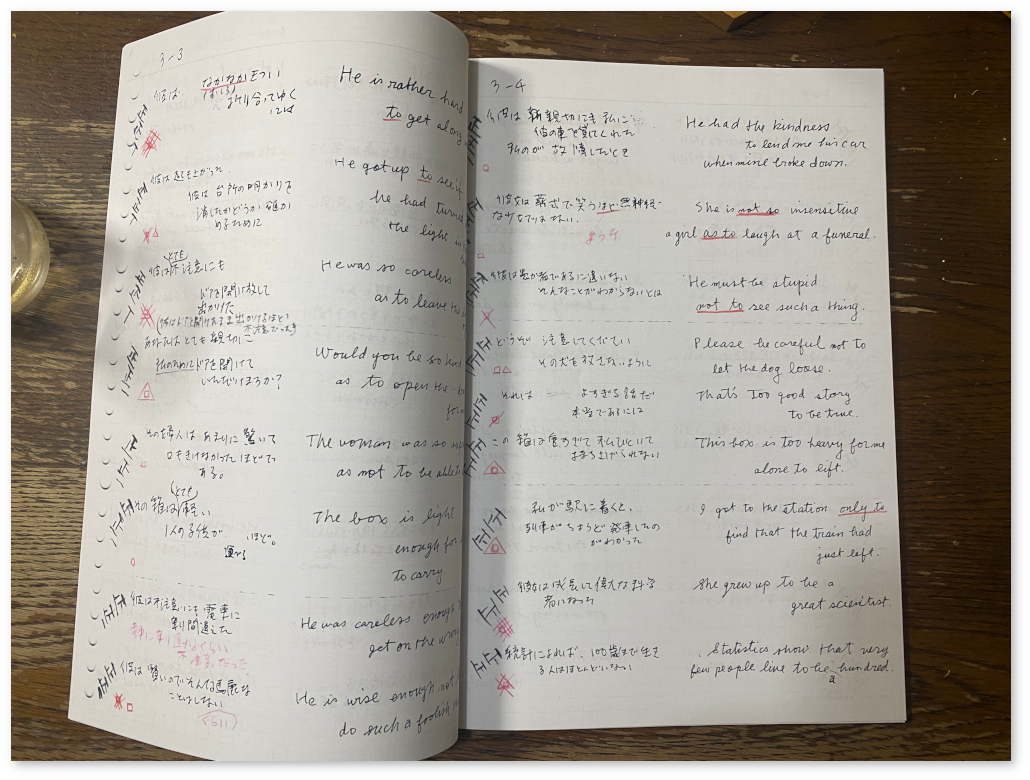 写真のノートは、500ちょっとの例文を毎日、和文英訳する練習するための大学受験レベルの文章を本から写したもの。寝る前には布団の中で、シャドウイングを20文章ずつやっている。