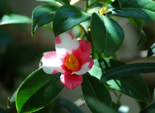 五色ツバキもたくさんあるようですが、たたずまいのいいのはコレでした。満開。