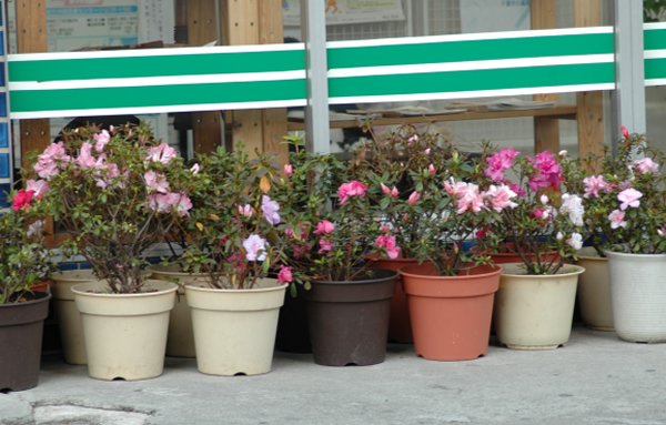寂しかった漢方薬局の前に、アザレアが並んでいた。