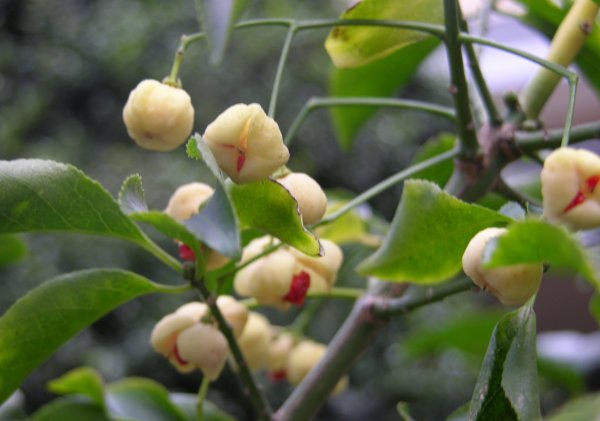 スーパーに行きながら、懐かしい道を通ったら代が変わってこんな実を見つけました。白いマユミです。
