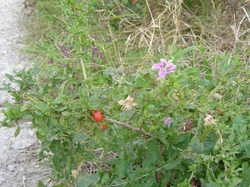 ピンクの花が咲き、小さな赤い実がついています。