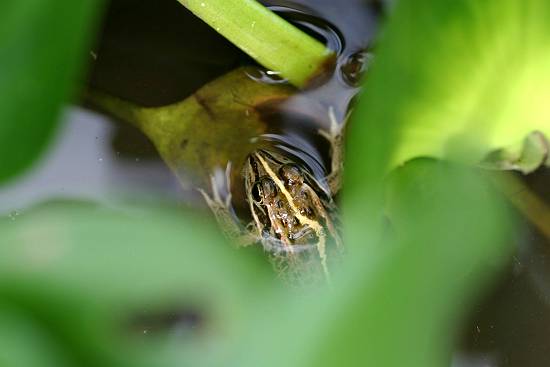 そこに蛙とメダカとホテイの花が咲いてました。(絵日記風に)