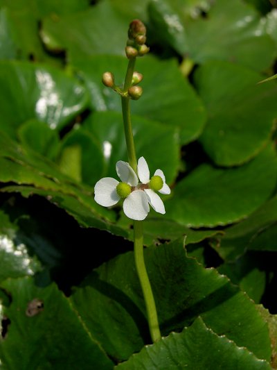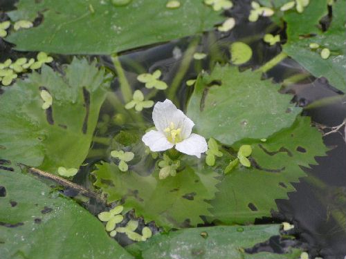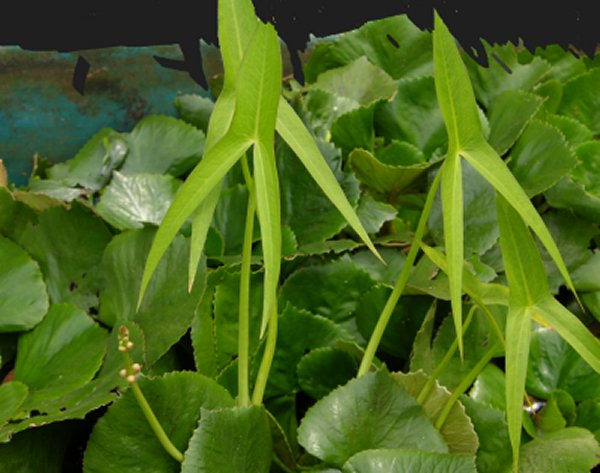 オモダカでした。周囲の厚い葉は、ヒシです。