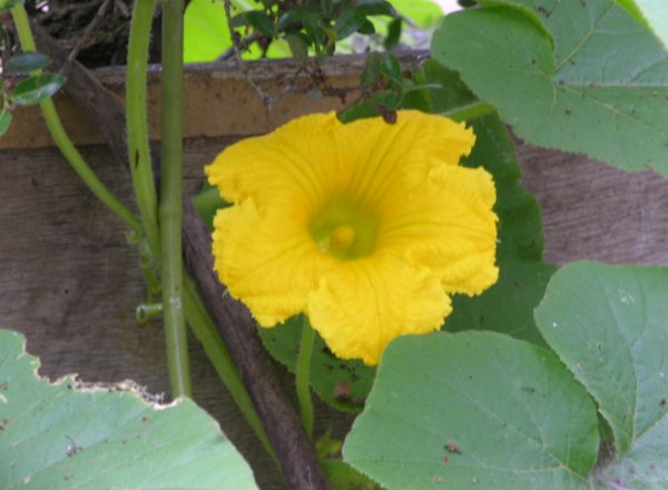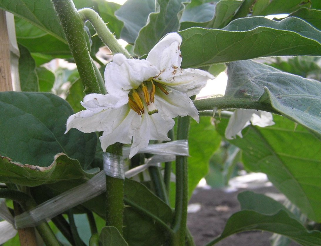 白茄子の花です。賀茂茄子くらいの大きさで皮は薄ーい緑色。
