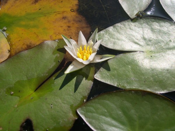 ヒツジグサは、その葉の形が羊の足跡に似ているということでついた名前らしい。スイレンよりずっと小ぶりで、4センチ四方くらいの花。最初は栄養状態の悪いスイレンかと思った(笑)