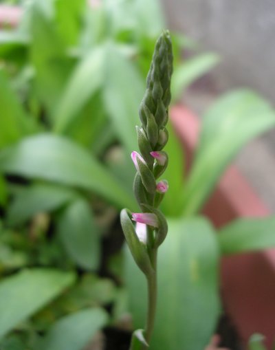 普通これを撮るときは、なかなか苦労です。でも、これは民家の鉢に植えられていたもの。とても気が早いネジバナです。きっともう一回撮るのでその時に、花が捩れていることやランの花であることを確認してください。