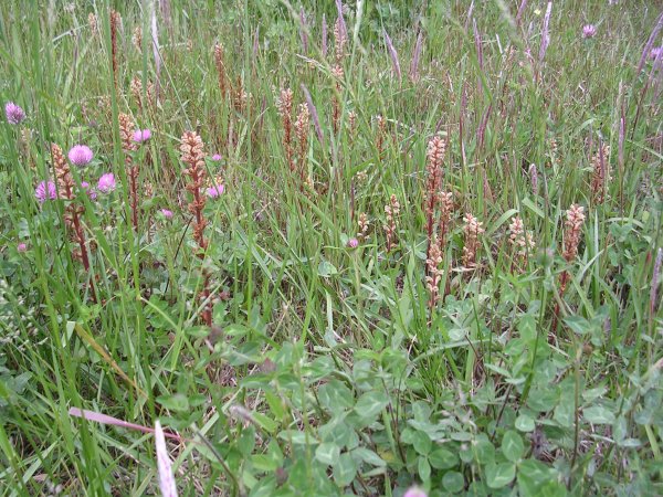 こんなにたくさん、ほぼ群生状態で驚きました。帰化植物で、近年生息域を拡大しつつあるそうです。マメ科を好み、ここではアカツメクサに寄生しています。他にもマメ科の植物(シロツメクサ、クスダマツメクサなど)があるのですが。葉も退化し、葉緑素を持たない植物です。去年、同じようなところで3本、発見。草刈機でぼうぼうの草を、夏に刈っていました。種だとするとこの頃に、種まき状態になったのかも知れない。二年間の観察になって、ちょっと面白かった。
