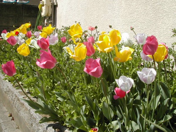 お隣のお家のチューリップとアナンキュラスです。種を撒くタイミングも絶妙で、こんなに咲く。脅威です。