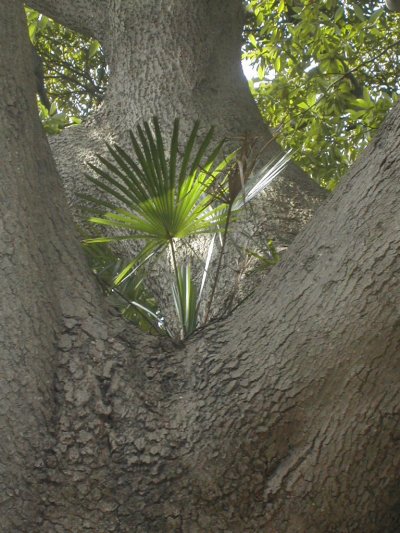 タブの木にシュロが生えています。鳥のいたずらでしょうか?