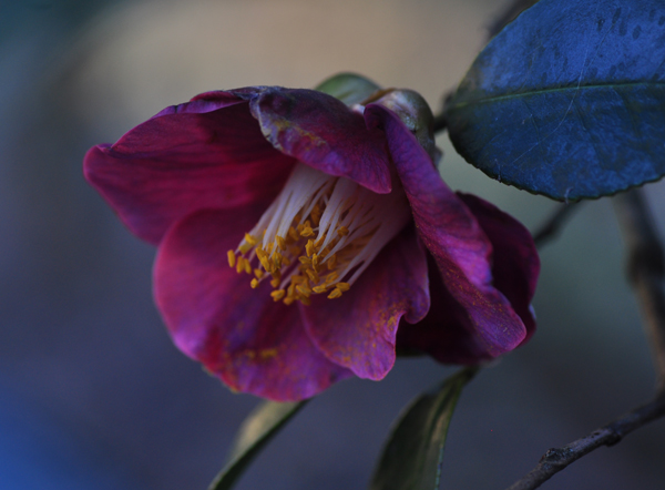 このツバキは寒いとブルーイングする種類らしい。(品種が特定できません。)