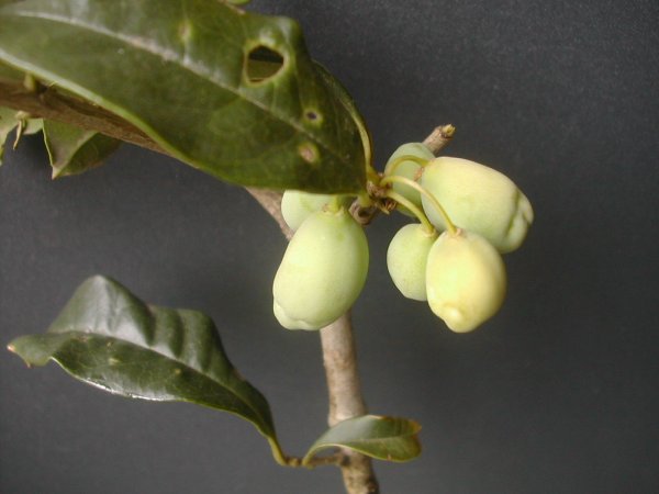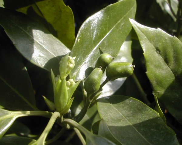 モクセイ(キンモクセイ・ギンモクセイ)は日本では、雄株しかなく実をつけない。これは鋸歯がないので、キンモクセイで実がなっていると大発見気分でした。(もう雌株が入ってたっていいじゃない?)