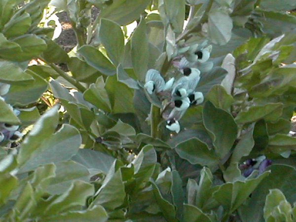 風の中で揺れていたソラマメ。花が咲いている。マメの鞘が天を向くので空豆(天豆)と聞いた。