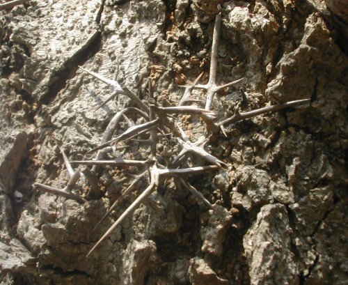 巣は、カラスかなぁ?と思ったのですが、確信をいだいたのは木が「サイカチ」だったからです。大きな木で、大きな豆ができますが、この棘。棘のうえに巣を作るという知恵はカラスじゃないか?そう思いました。