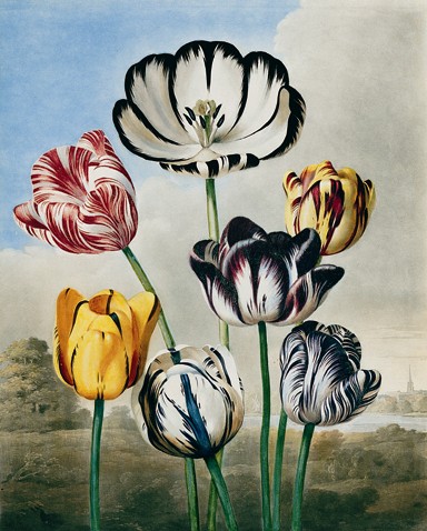 1812年刊より。チューリップ。リンネの分類学を解説する精密で最も美しいといわれる植物図譜。ソーントンはイギリスの医者であった。