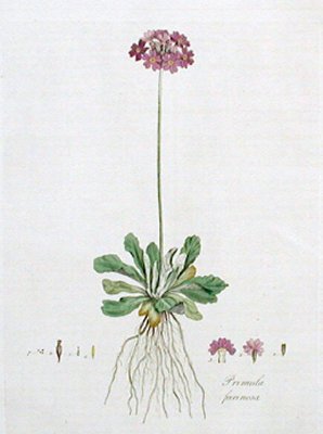 1777年「ロンドン植物誌」サクラソウ。毎度のW・Curtisの画です。最初にこの本を出して、地味だったために売れず彼は失敗します。現在に続くボタニカル・マガジンはこのあとに出版されます。