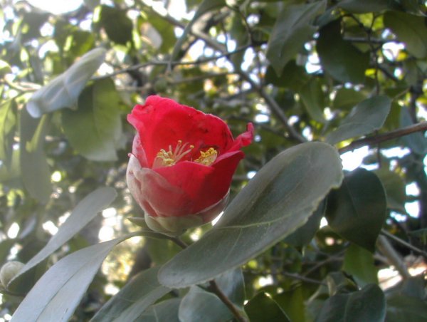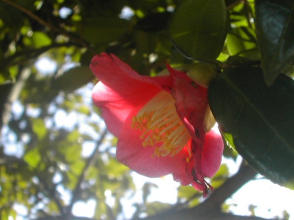 藪椿を仰角で写しました。西日です。