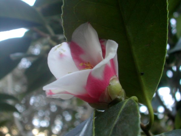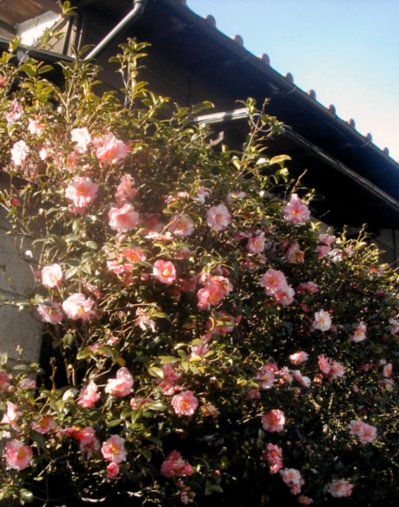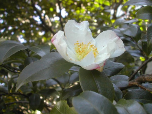 これは暗くて高いところにあって、ちょっと苦労した。他の写真はみんなフラッシュになってしまった。よって真っ暗。ひとつひとつの花の、模様が違う侘助なのでもう少し欲しかったな。