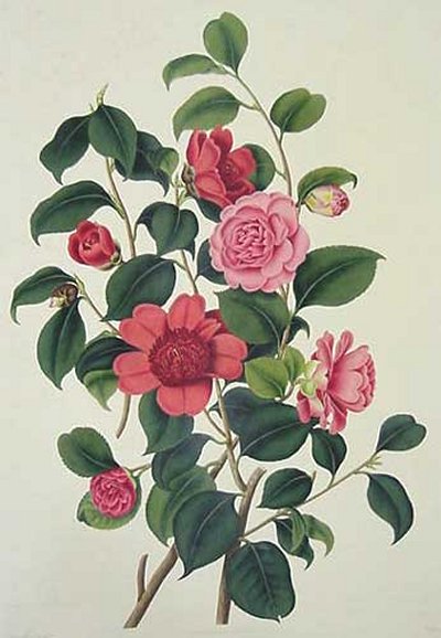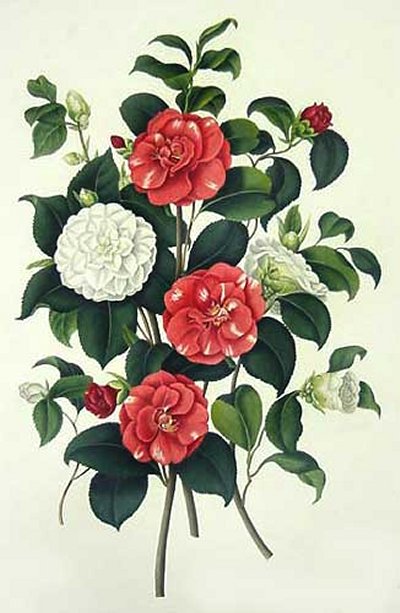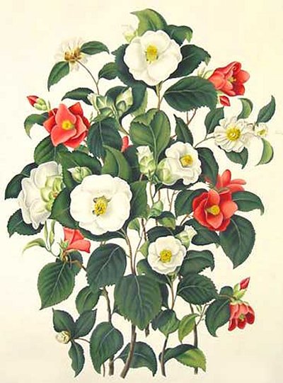 Samuel Curtis, 1779-1860サミュエル・カーティスはウイリアム・カーティスの息子です。椿はシーボルトがヨーロッパに持って行きました。だからだと思いますが、絵は割合少ないようです。これは、澁澤龍彦の「フローラ逍遥」の表紙になった図です。色合いが少し違いますね。何枚か似たものを紹介します。
