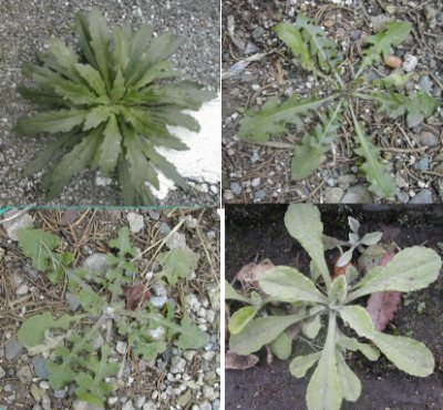 左上がヒメムカシヨモギ、右上がノゲシ、右下がタンポポ、左下がチチコグサモドキ。