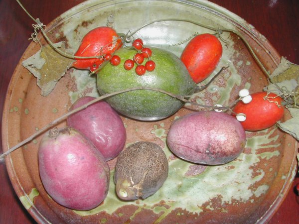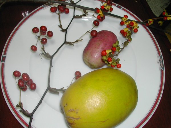 一番上の、黄と赤のが「ツルウメモドキ」赤い実が交互になっているのが「サルトリイバラ」(サンキライ)むらさきの実が「ムベ」大きいのがカリンです。