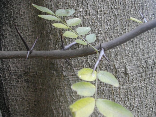 でも、この写真はどうですか?樹皮もわかるし、棘もマメ科の葉も枝が回っているのでわかるでしょう。苦肉の策。花のときにはいきあたらないので失礼。(-_^:)