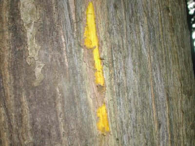 二本のキハダが千葉大にはあって、薬学部の学生がそれを知ると、確認のために皮を削ります。すると、こんなに黄色い皮にたどり着く。これがキハダのいわれです。(キハダマグロはわかりません。 汗)葉は高いところなので写真が撮れない。