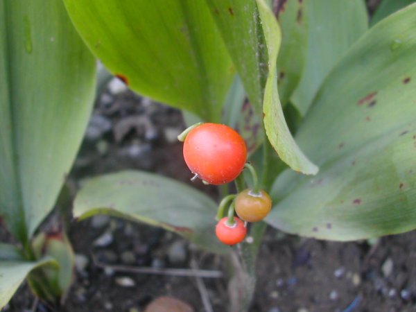 スズランが春先にはどの家も、というくらい咲いていました。季節がすぎると気づかないようですが、こんなに大きな実がつくのです。結実していないのもあるのですが、どういう条件ならなるのかな?毒です。