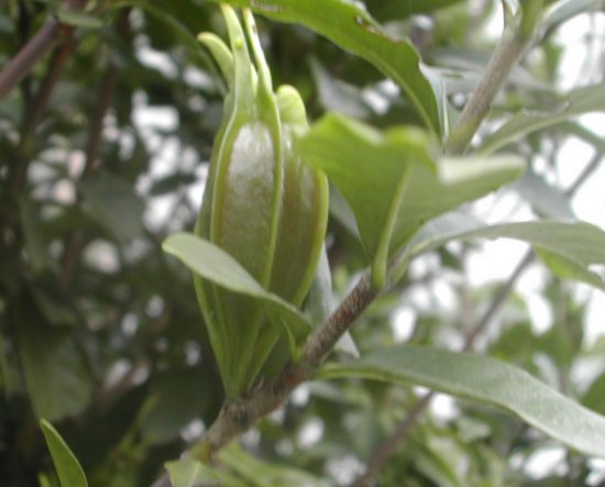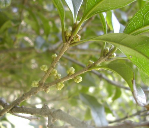 もうそろそろだと思っていたら、こんなに蕾が膨らんでいました。雌雄異株で、日本には雄株しか渡来していない。ギンモクセイとの区別は、こちらの方が全縁(ぜんえん=ギザギザがない)こと。たまに例外はありますが、だいたいこれでOKです。ギンモクセイは地味ですがこれのルーツ。楊貴妃が飲んだという桂花陳酒も、ギンモクセイで作らせたとか。