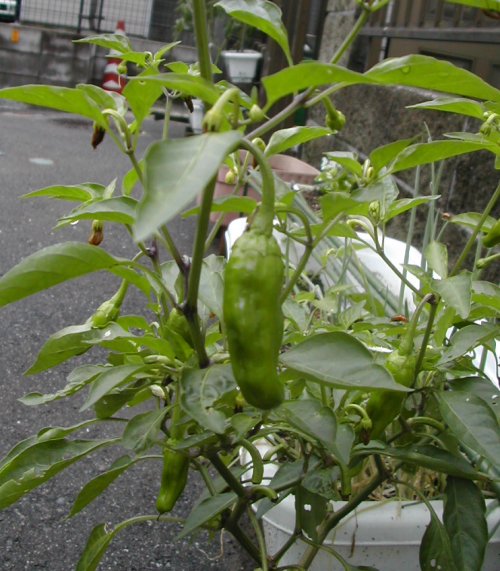 不景気のせいかと思うほど、庭先園芸をしている家はおおい。だが、「ししとう」は今年初めてだ。写真を撮っていたら、怖そうな表情で家の人がでてきた(笑)シシトウはピーマンの仲間と、トウガラシの仲間をかけあわせたものらしい。一つ一つが辛かったり、辛くなかったりまさしく不安定な植物ということらしい。