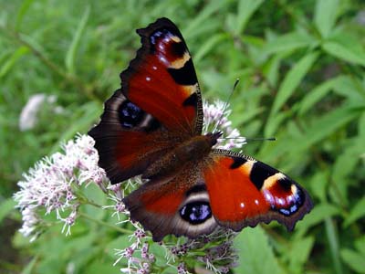 ヒヨドリバナにとまる「クジャクチョウ」の写真です。