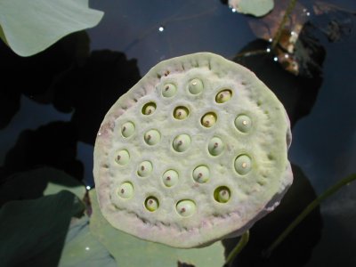 ハスの実。この中の豆のようなのが生でも美味しい。(加工品は中華にある。またハスの実はもともと長寿らしい)ほうずきが赤らむのもこの頃です。
