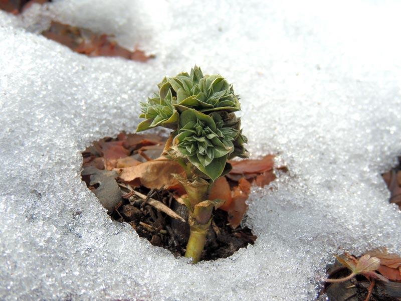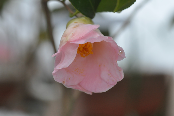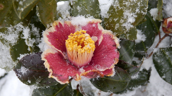 初めての花なので立派に咲かそうとしていたら、雪だ。