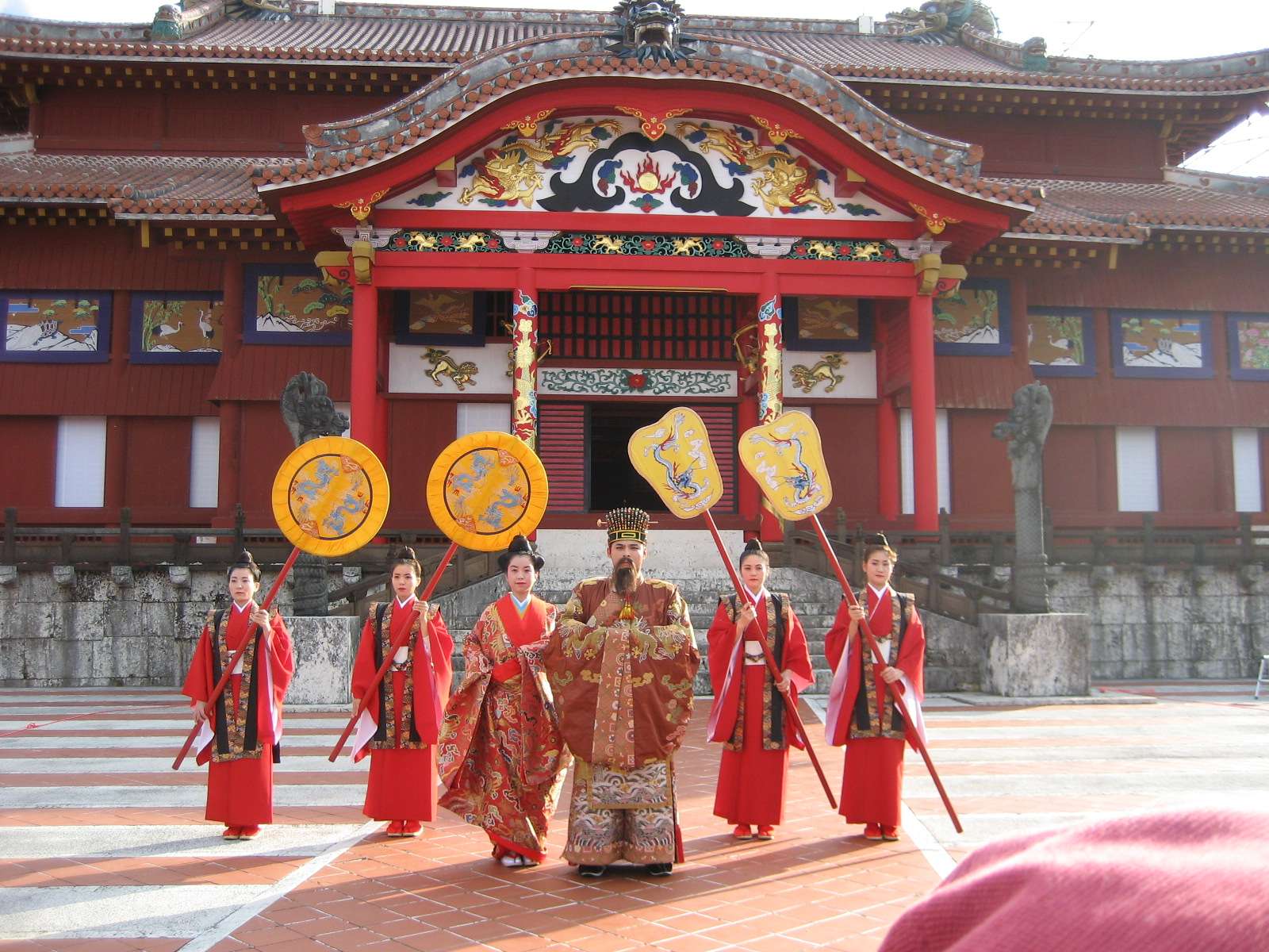 写真は首里城の新春の宴1月3日「国王王妃出御」、観光客にサービスでやってるみたいです。ほんとは1月1日と2日の琉球王朝正月儀式再現「朝拝御規式」てのを見たかったんですけど。