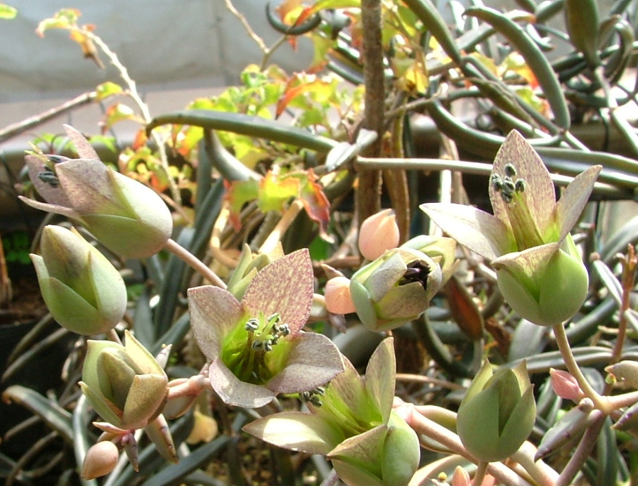 変わった形の花ですよね。葉はマツバギクみたいな感じなのに。