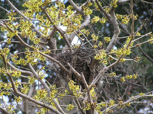 我が家の満作が満開になりましたが、鳥の巣が