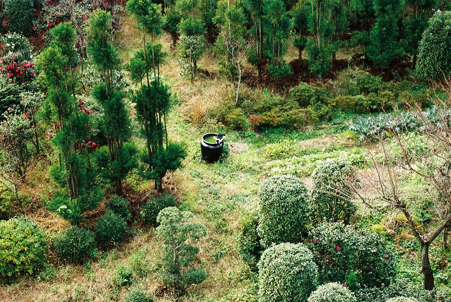 続き。真ん中の雨水貯めの壷のうえに猫がいます。