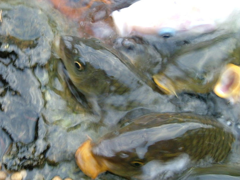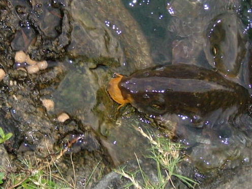 意地悪して鯉の餌を水際の陸の部分に置いてみた。
