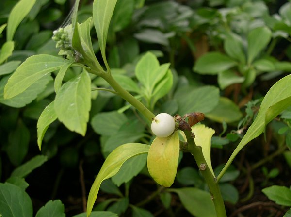 フッキソウです。なんで実に二つの孔が、あるのか不思議です。これも食べると甘いのですが、ヤマボウシの方が上。