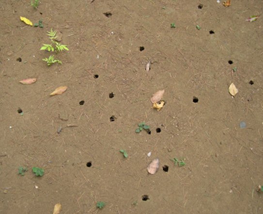 昨日の公園のクスノキの下の、セミの穴です。