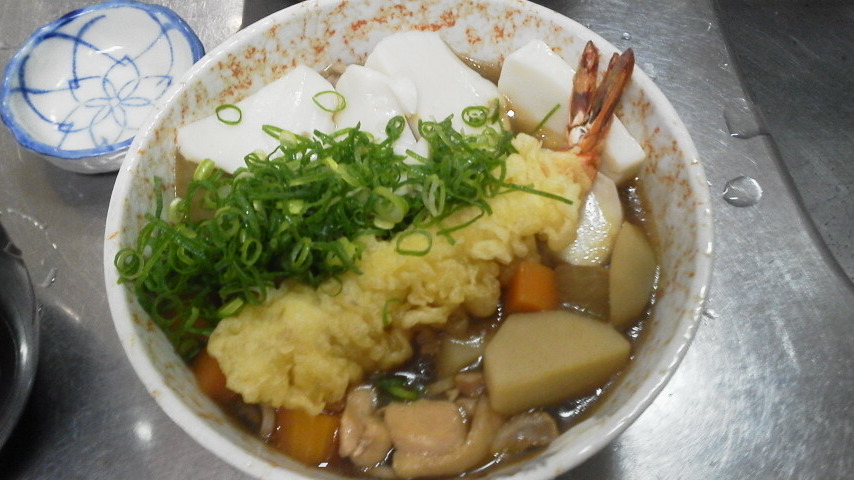 雑煮用に鶏肉を煮て、少しずつ冷凍保存する。残りの汁に具を入れて、天ぷら・ネギ。