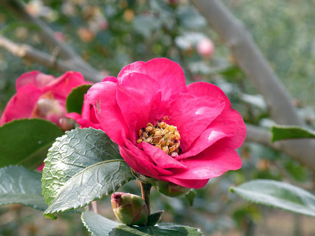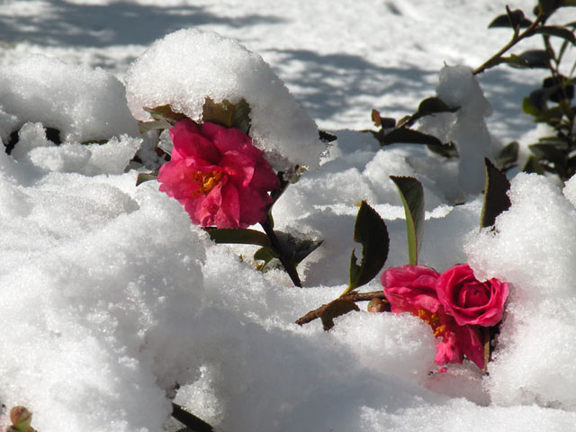 昨日の雪がサザンカに積もった様子です。