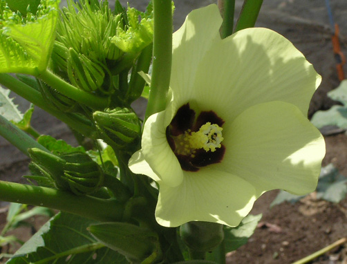 野菜の花はつつましい花が多いですが「オクラの花」は綺麗です。オクラのねばねばは身体にいいみたいですね。