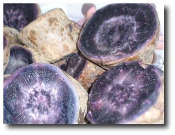 きょうは紅芋のご紹介です。ご覧の通りの紫色のきめの細かい上等の芋です。ふかしたり、焼き芋にするだけでも十分美味しいのですが、きょうは、これをグラタンにしましょう。別にむつかしいことはありません。