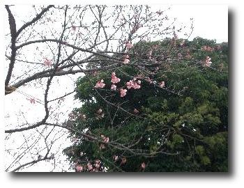 ひたすら大寒の強風が吹きつけていた。寒さに震えて見つけたのは、曇天の下のカンヒザクラだ。風にあおられて健気に花を咲かせていた。頑張っているから、はらはらと散っていく花びらはなかった。・・・しかし、さぶかった!!!